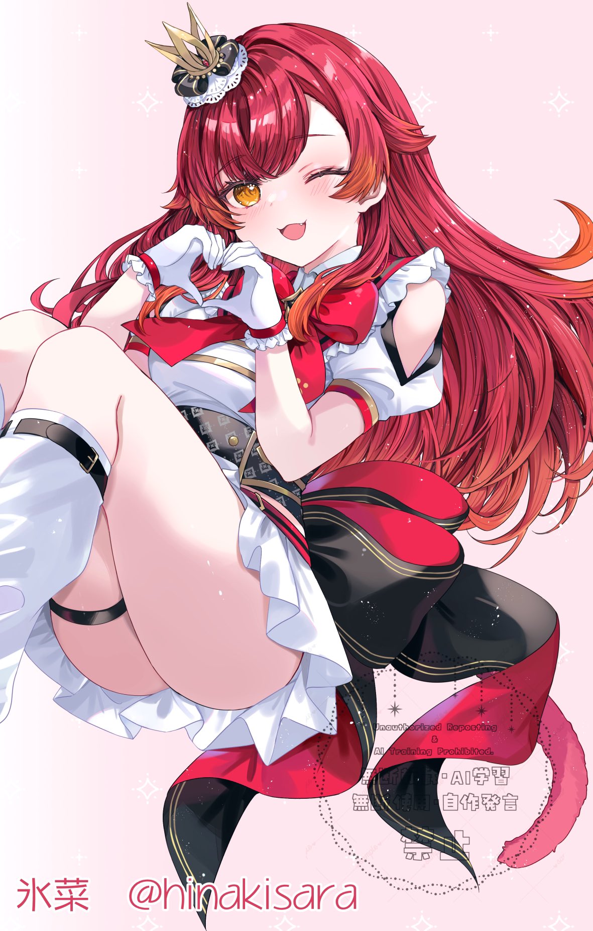 1girlartist namecat girlcat tailclothing cutoutcrowndressfanggloveshands upheartheart handsleg warmerslong hairlooking at viewermini crownopen mouthorange eyespink backgroundred hairshort sleevesshoulder cutoutsimple backgroundsolotailthigh straptwitter usernamevirtual youtuberwhite gloveswhite leg warmers