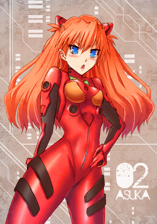 :o1girlangryarm behind backblue eyesblushbodysuitbracerbreastscharacter namecowboy shotfemale focusglovesgrey backgroundhair between eyeshair ornamenthand on own hiphip focuslegs apartlong hairlooking at viewermecha pilot suitnarrow waistorange hairplugsuit (evangelion)small breastssolothighstriangle mouthturtlenecktwo side upv-shaped eyebrowszipper