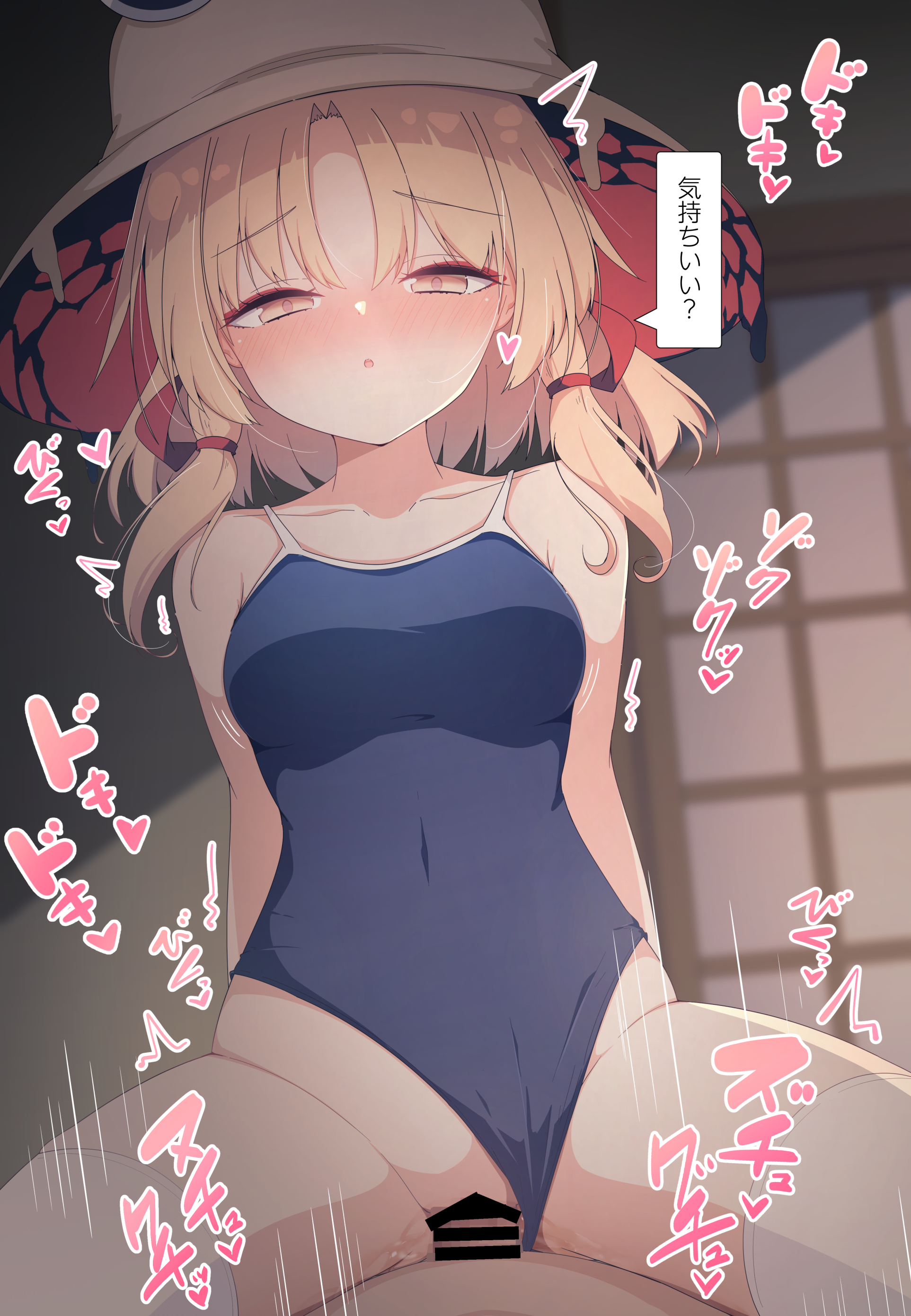 1boy1girlbar censorblue one-piece swimsuitblushbreastsbrown hatcensoredclothing asidecowgirl positiongirl on tophalf-closed eyeshatheterolooking at viewermedium breastsmedium hairone-piece swimsuitpovschool swimsuitsexstraddlingswimsuitswimsuit asideyellow eyes