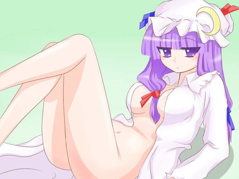 1girlarm supportbottomlessbreastscleavagecrescentfemale focushatlegslong hairnavelopen clothesopen shirtpurple eyespurple hairshirtsolo