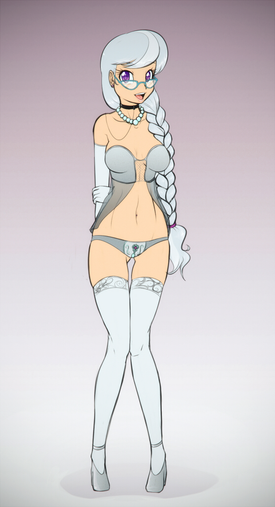 1girlsbraidcorsetelbow glovesfemalefemale onlyFlag for Deletionglassesgloveshigh heelshumanhumanizedlegwearlong hairpurple eyessilver hairsolostandingstockingsthighhighsunderwear
