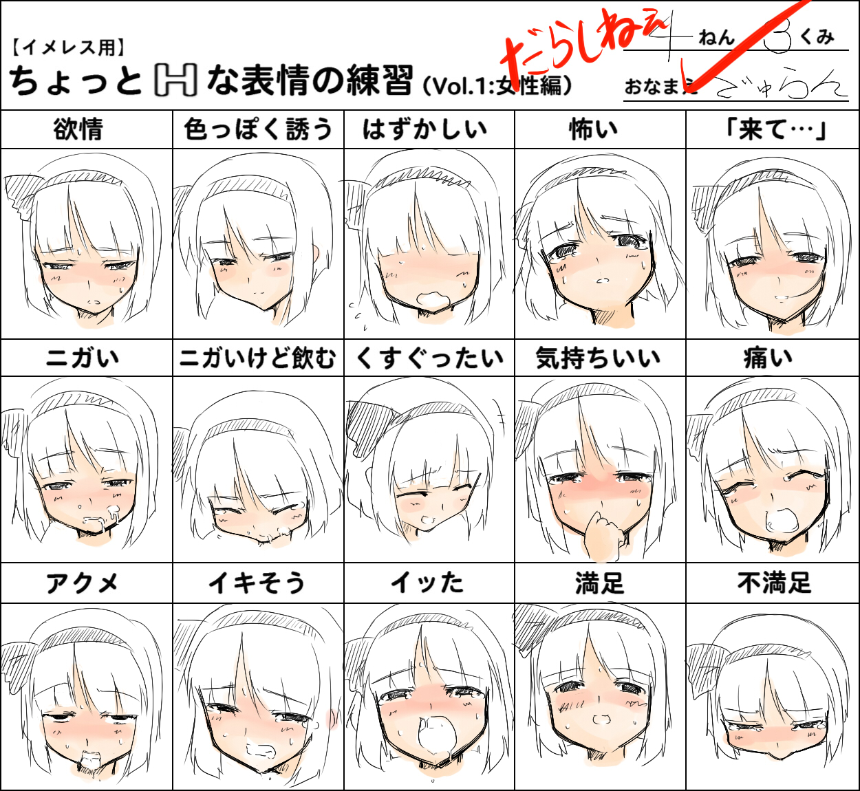 1boy1girlblushclenched teethcumdroolingembarrassedfemale focusflying sweatdropsfull-face blushhairbandjitomelooking downmultiple drawing challengemultiple expressionsone eye closedshort hairsketchslightly naughty expressions practicesmilesolosweatteethwhite backgroundwhite hairwink