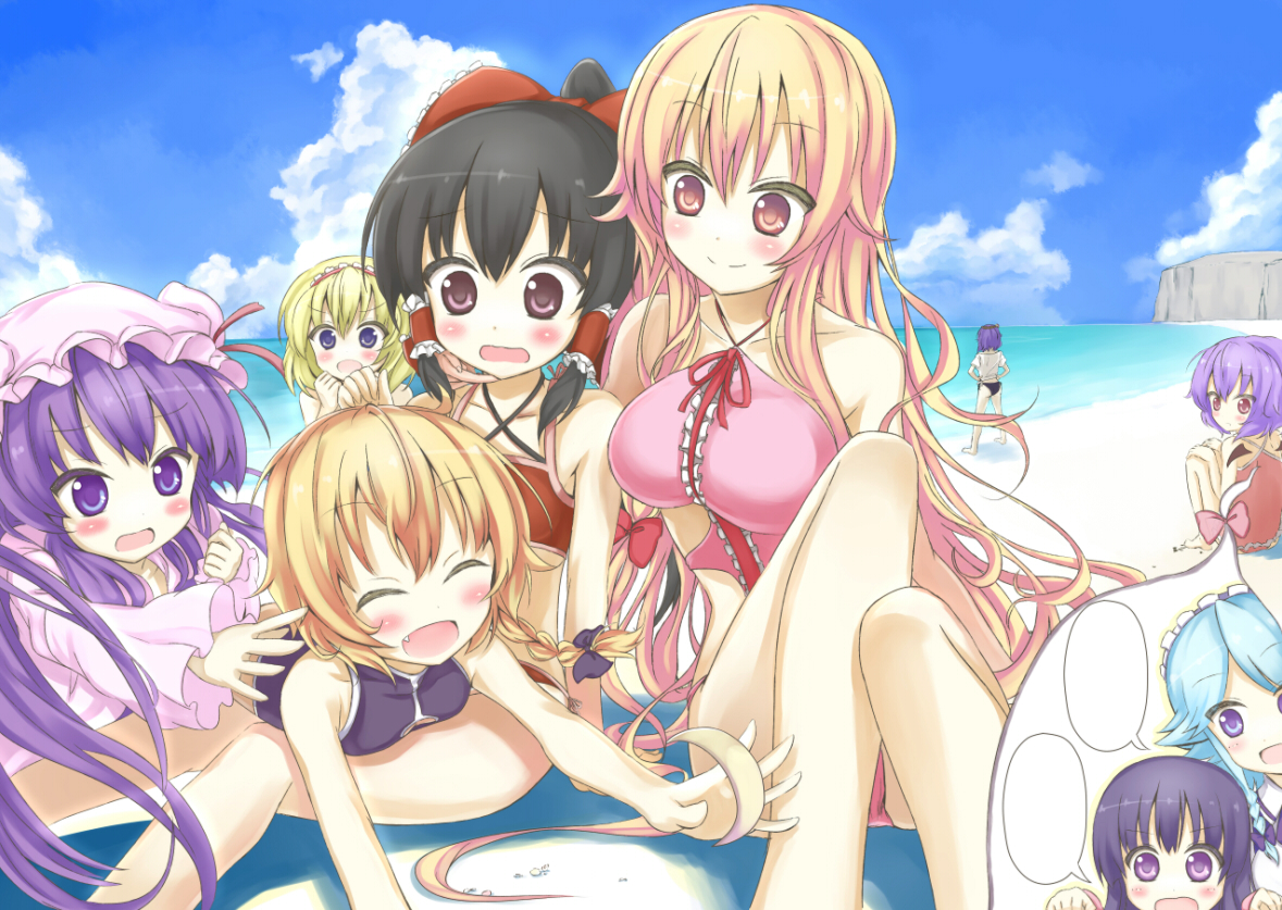 6+girlsbad anatomybad handsbat wingsbeachbikiniblack hairblank speech bubbleblonde hairblue eyesblushbowbraidbreastsbrown eyescasual one-piece swimsuitdayfemale focusgap (touhou)hair bowhair tubeshairbandhathime cutlarge breastslong hairlying on laplying on personmaid headdressmultiple girlsoceanone-piece swimsuitoutdoorspoorly drawnpurple eyesred eyessandshoreshou21single braidsmall breastsspeech bubbleswimsuittankinithought bubblewings