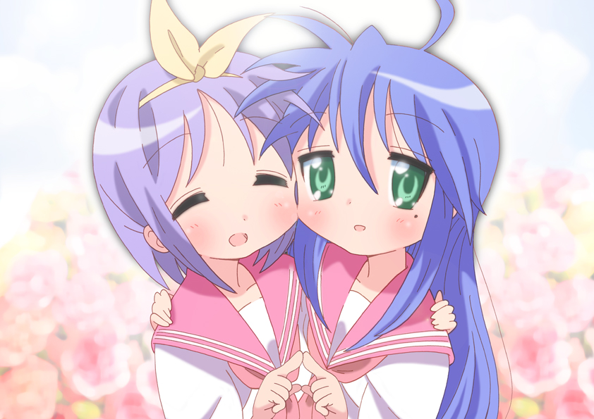 00s2girlsahogeblue hairclosed eyesflowergreen eyeslong hairmolemole under eyemultiple girlspurple hairschool uniformserafukushort hair