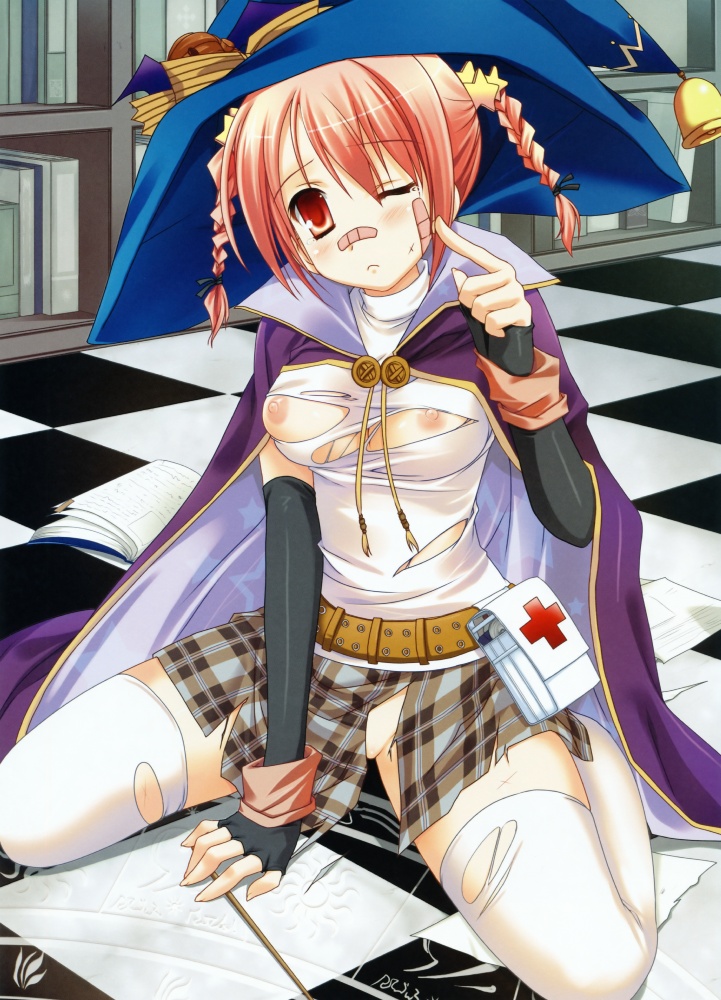 1girlbandagesbreastscapeelbow glovesfemale focusfingerless glovesfrowngloveshatkneelingnipplesno brano pantiespink hairplaid clothesplaid skirtred eyesskirtsolospread legsthighhighstorn clotheswand