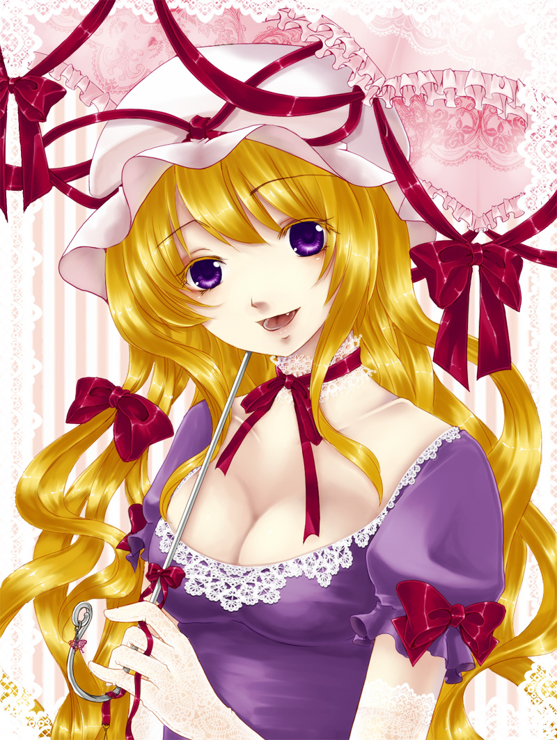 1girlblonde hairbreastscleavageelbow glovesfangfemale focusgloveshair ribbonhatlarge breastslong hairpurple eyesribbonsoloumbrella