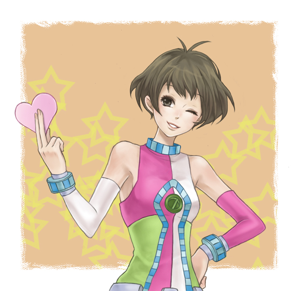 00s1boyalternate costumeantenna hairbare shouldersbrown eyesbrown haircosmic & funny (idolmaster)crossdressingcrossdressing (mtf)heartmale focusone eye closedshort hairsmilesolotrapwink