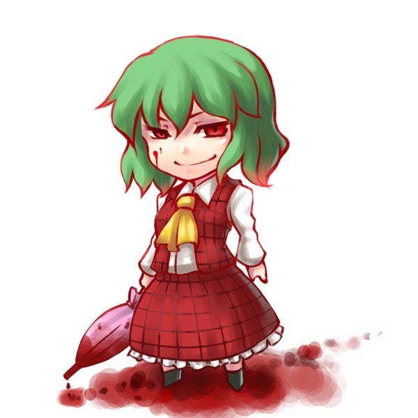1girlascotbloodblood on facechibiclosed umbrellafemale focusgreen hairplaid clothesplaid skirtplaid vestred eyesshort hairskirtskirt setsmirksoloumbrellavestwhite background