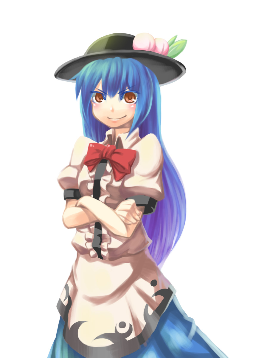 1boy1girlblue haircolored eyelashescrossed armsfemale focusfoodfruithatlong hairpeachred eyessimple backgroundsmilesolov-shaped eyebrows