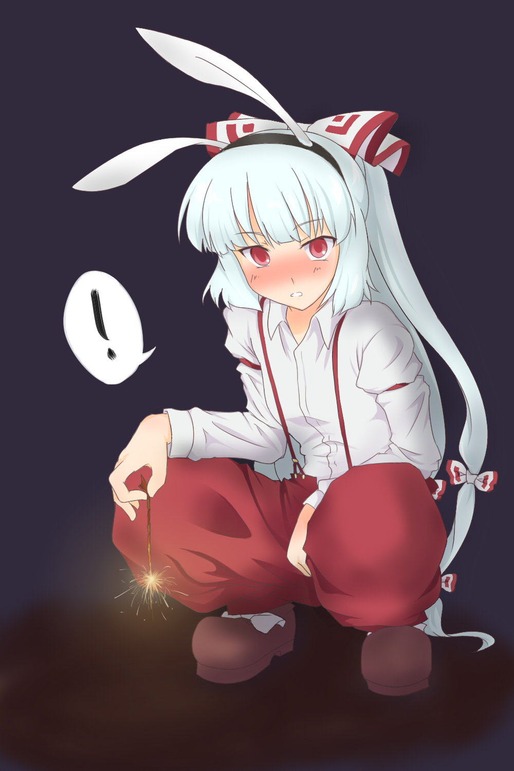 1boy1girlanimal earsblushfemale focusfull bodyhair ribbonhairbandkneelinglong hairrabbit earsred eyesribbonsolosquattingsuspenders