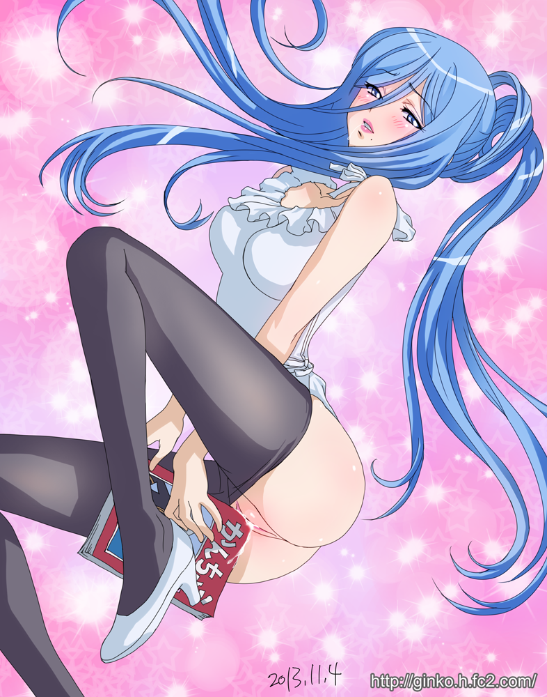 apronbare shouldersblack legwearblue eyesblue hairblushbookbreastsfemaleFlag for Deletionlong hairlooking at viewermasturbationopen mouthpantyhosepantyhose pullponytailpussy juicesmilesolotied hair