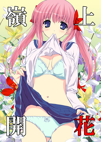 00s1girlbrabreastscleavageclothes liftfemale focusflowerhair ribbonlingeriemouth holdnavelpantiespink hairribbonschool uniformserafukushirt liftskirtskirt liftsolotwintailsunderwear
