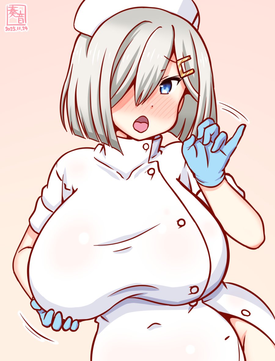 1girlartist logoblue eyesblue glovesbreastscowboy shotdateddressfellatio gestureglovesgradient backgroundgrey hairhair over one eyehatin heatlarge breastslogonaughty facenursenurse capopen mouthoral invitationpink backgroundselfieshort hairsolotonguetongue outwhite dresswhite hat