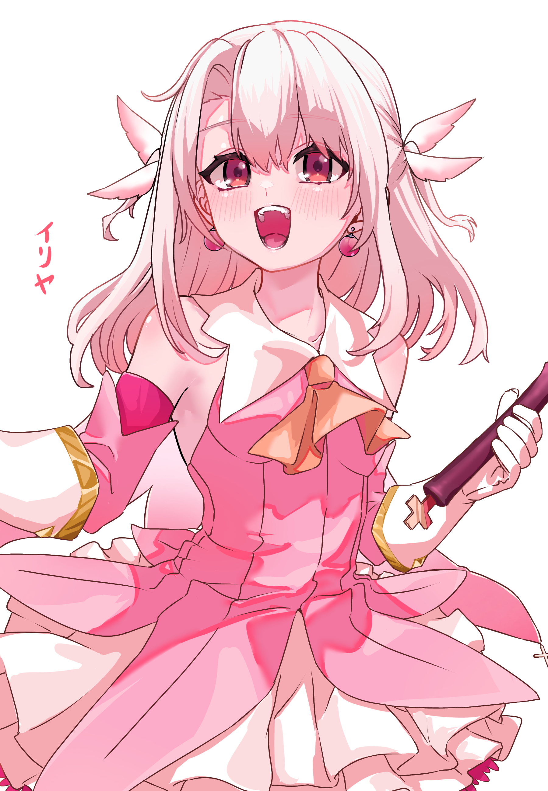 1girlascotbare shouldersblushbreastscapedressearringselbow glovesfeather hair ornamentfeathersgloveshair ornamentjewelrylayered gloveslong hairlooking at vieweropen mouthpink dresspink glovesred eyessidelocksskirtsmall breastssmilesolosphere earringstwo side upwandwhite capewhite gloveswhite hairwhite skirt