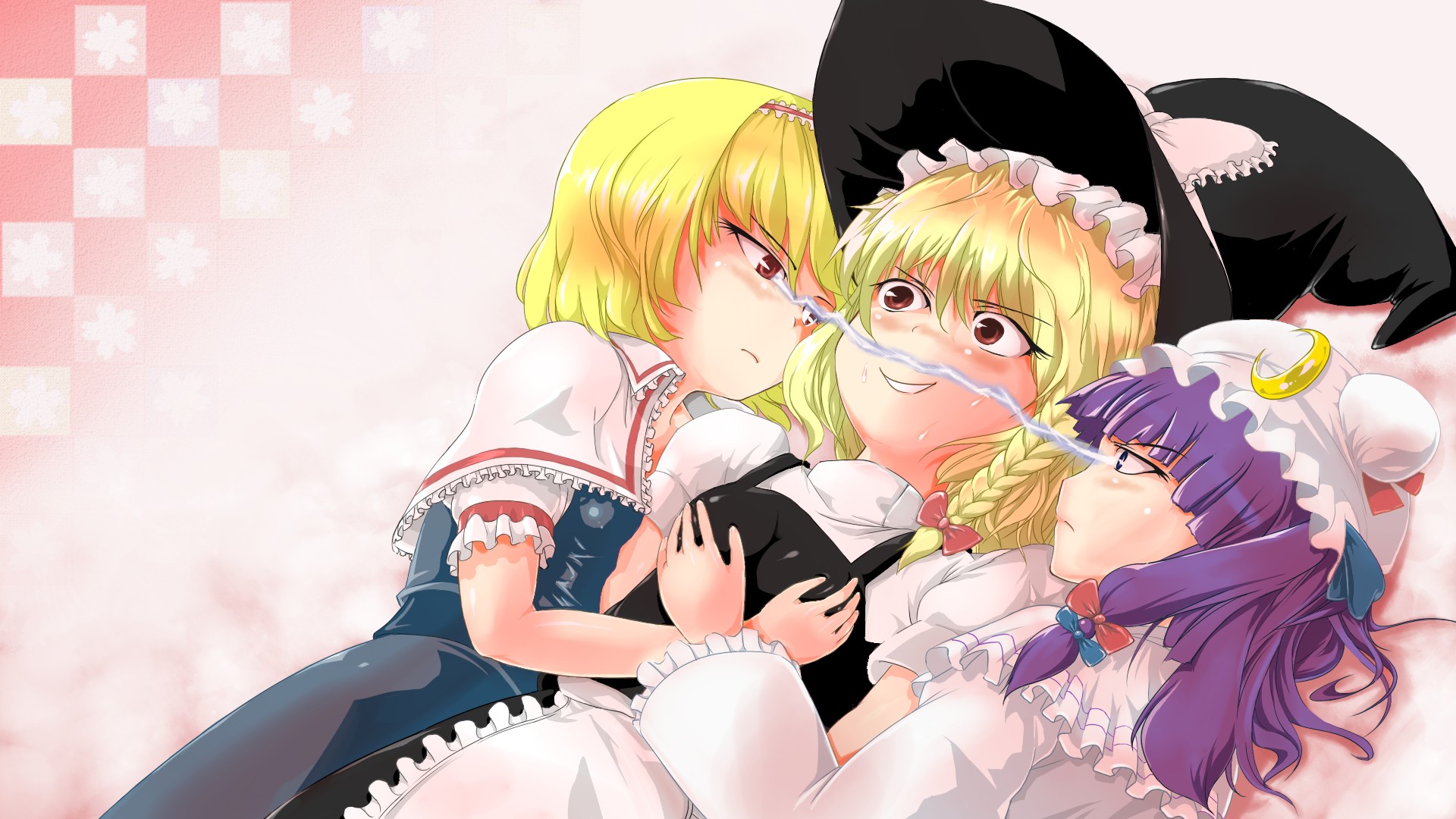 3girlsblonde hairbookbraidbreastsdressfemale focusgirl sandwichgrabbing another's breastgropinghairbandhathugjealouslyingmultiple girlson backon sidepurple eyespurple hairred eyessandwichedshort hairwitchwitch hatyou gonna get rapedyuri