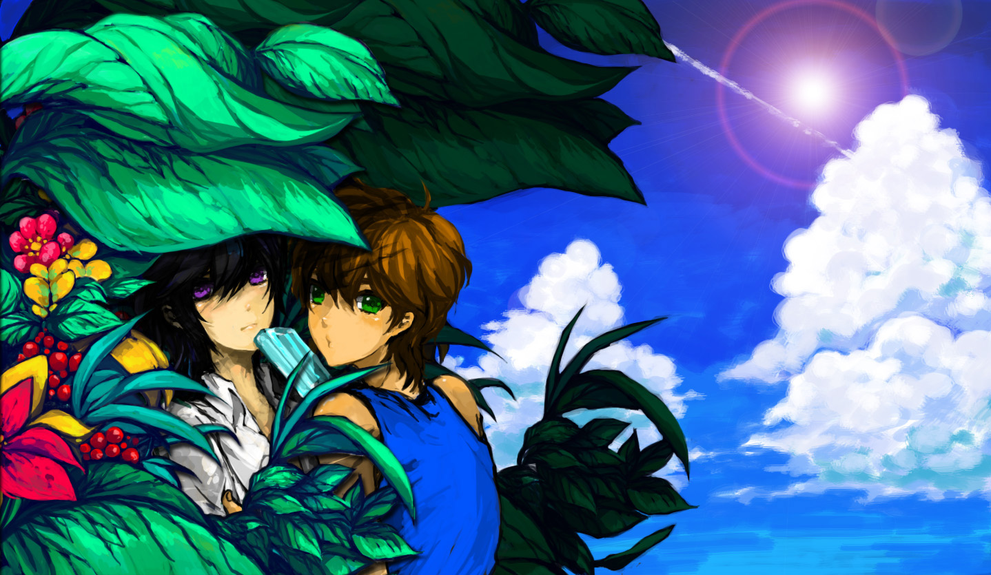00s2boysblack hairbrown hairflowergreen eyesmale focusmultiple boysnatureoutdoorsplantpurple eyesskyupper body