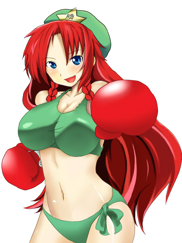 1girlblue eyesboxing glovesbraidbreastsfemale focushatlarge breastslong hairmidriffnavelred hairsolosports bratwin braids