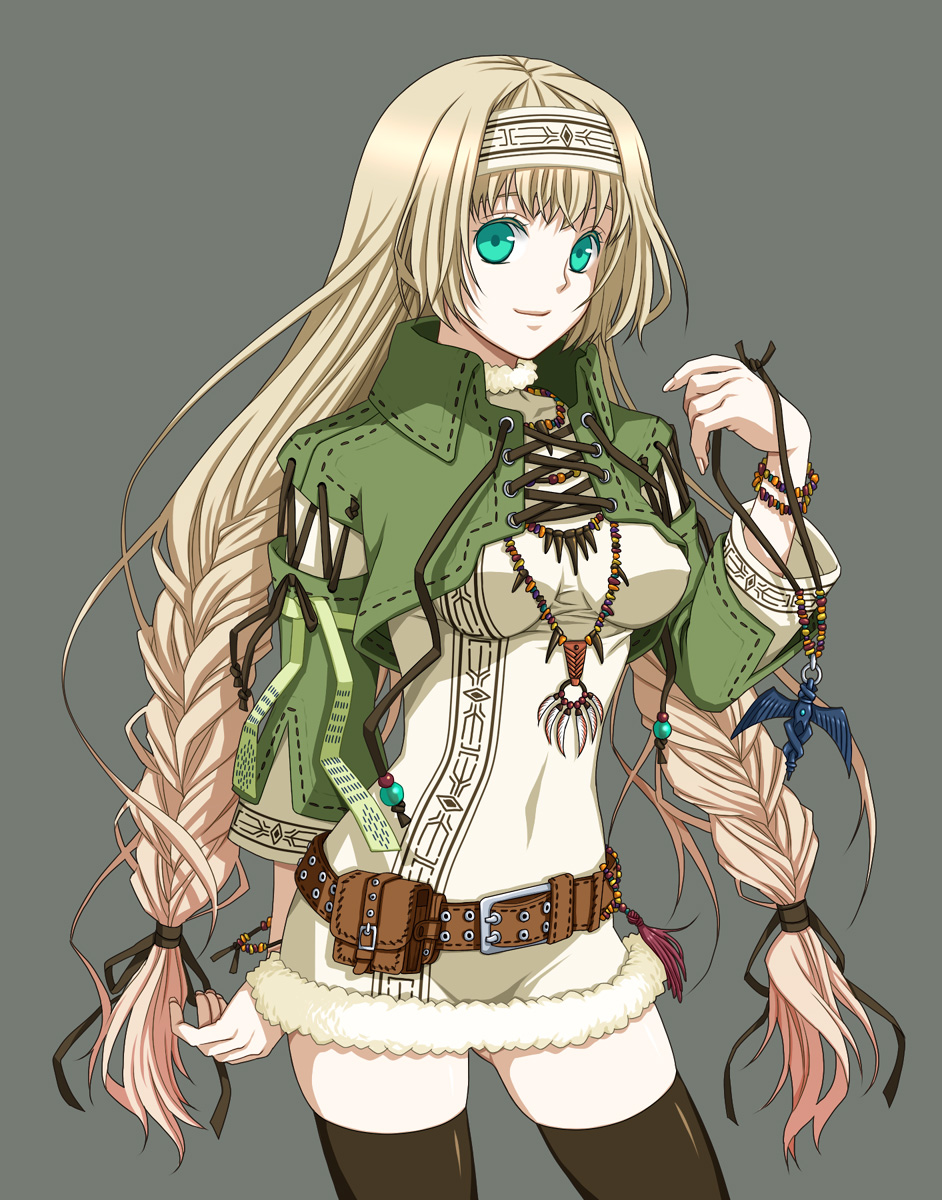 1girlbeadsbeltblonde hairbraceletbraidbreastsfemale focusgreen eyesjewelrylong hairnecklacesimple backgroundsmilesolothighhighstwin braidsvery long hairzettai ryouiki
