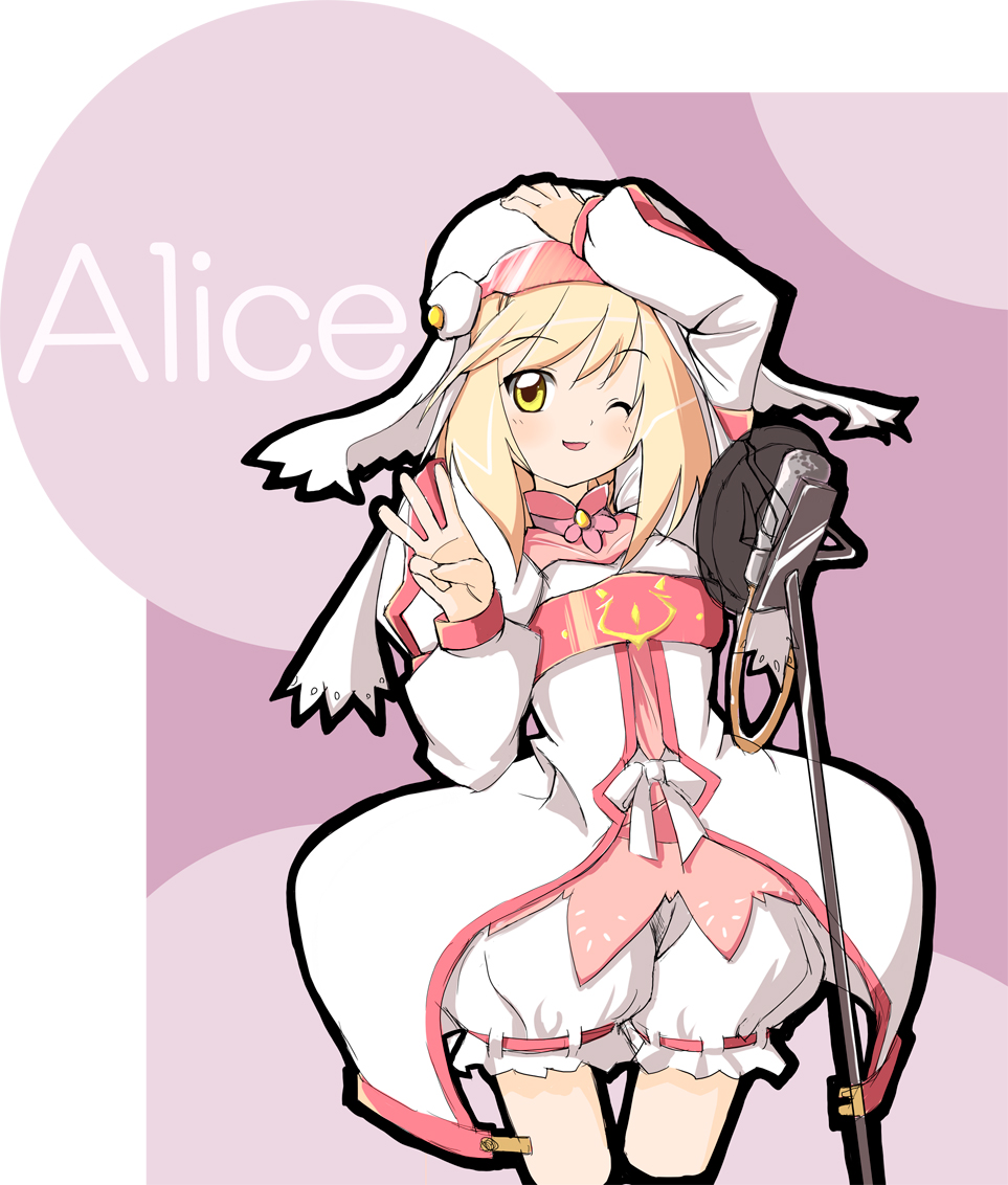00s1girlblonde haircharacter namecopyright namefemale focushatmicrophonemicrophone standone eye closedpurple backgroundsmilesolowinkyellow eyes