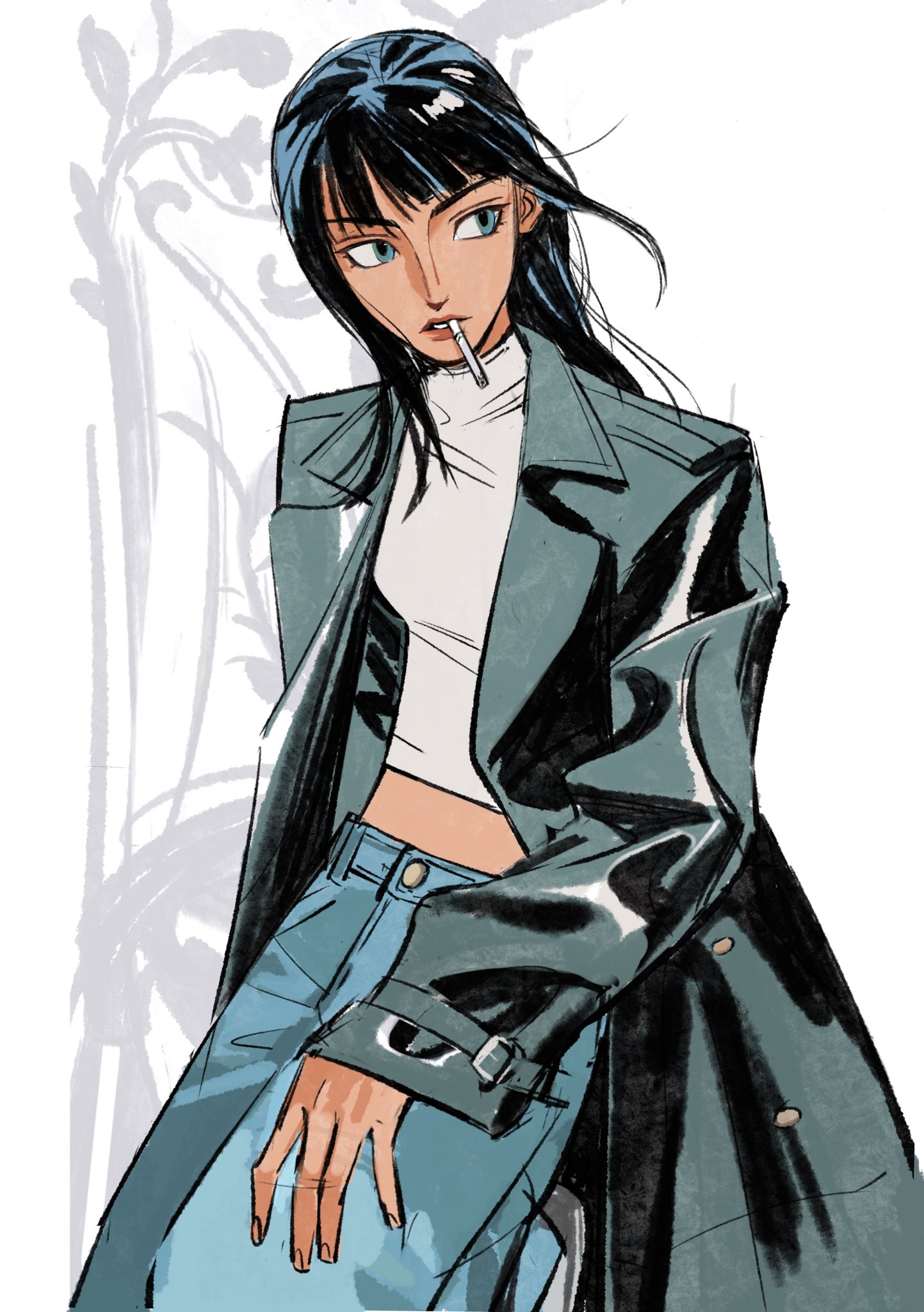 1girlblack coatblack hairblue eyesblunt bangscigarettecoatcowboy shotcrop topdenimfloating hairjeanslong hairlooking to the sidemidriffpantsshirtsoloturtleneckwhite shirt