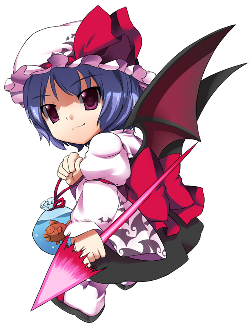 1girlbat wingschibifemale focusfishfull bodyhatjapanese clotheskimonopolearmred eyessimple backgroundsolospearspear the gungnirstandingweaponwhite backgroundwings