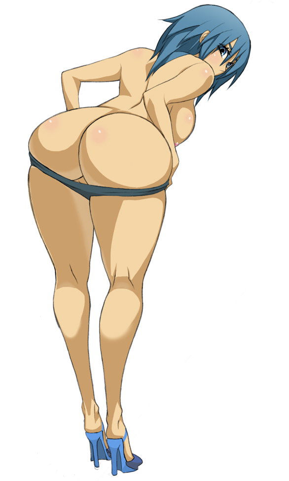 1girlassblack pantiesblue eyesblue hairbreastsfemale focusfull bodyhigh heelskneepitslooking backmatching hair/eyesmedium breastspantiespanty pullshoesshort hairsimple backgroundsolostandingthick thighsthighstopless femaleuncensoredunderwear