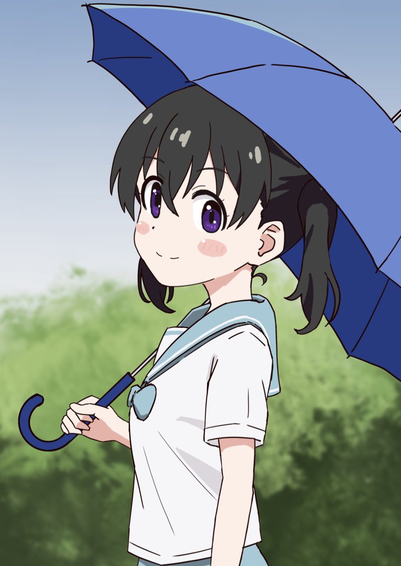 1girlblack hairblush stickersclosed mouthdaydot nosefeet out of framefemale focushair between eyesholdingholding umbrellalooking at vieweroutdoorspurple eyessailor collarschool uniformserafukushirtshort hairshort sleevessmilesolostandingumbrellawhite shirt