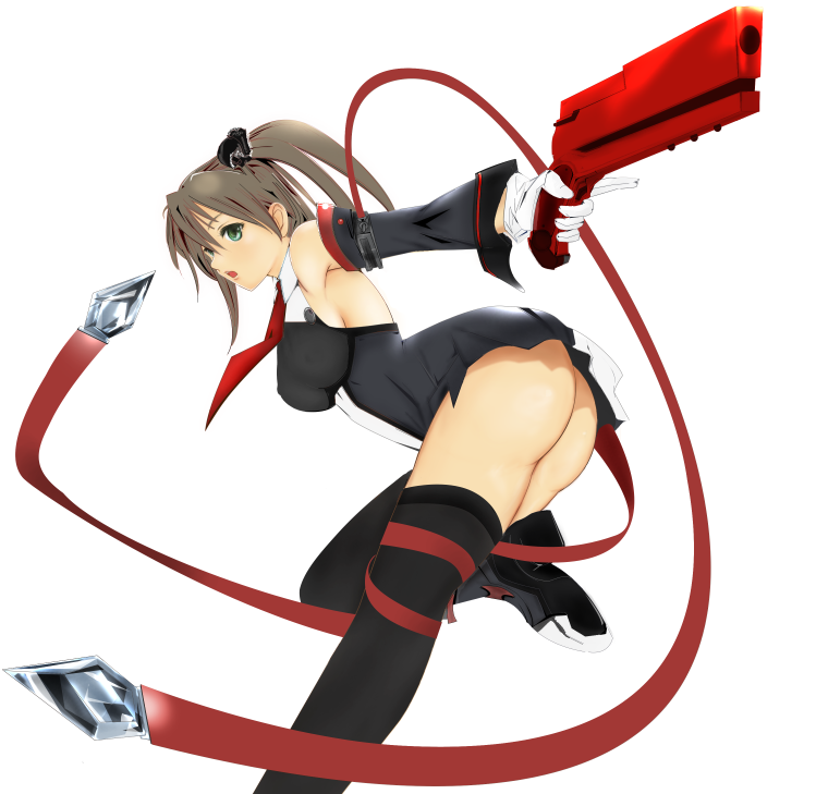 1girlalternate colorassbrown hairdetached sleevesfemale focusglovesgreen eyesgunnecktiesolothighhighstwintailsweaponwhite gloves
