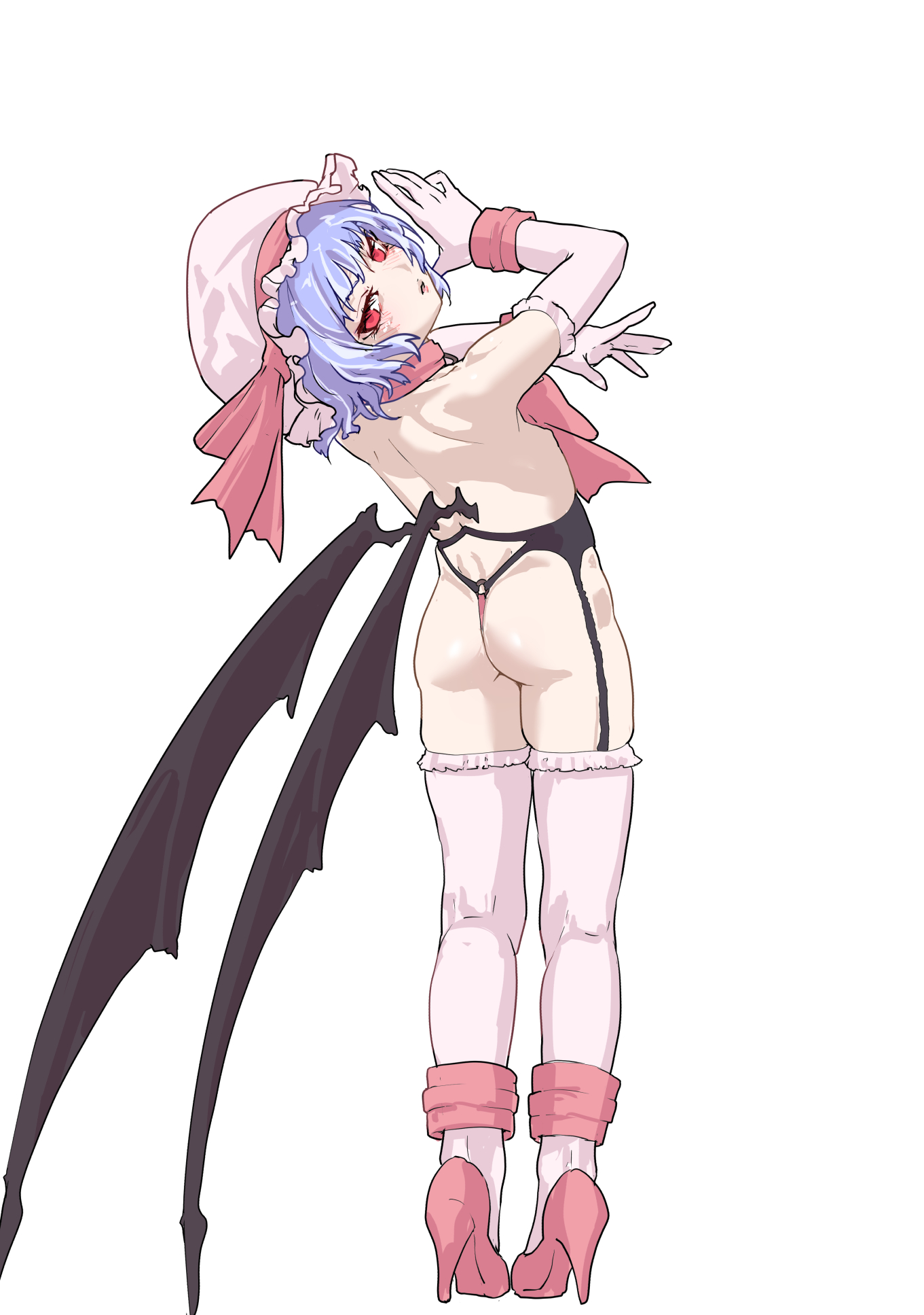 1girlassbat wingsblue hairblushelbow glovesflat chestfrilled thighhighsfrillsfrom behindfull bodygloveshathead tilthigh heelslooking at viewerlooking backmob capred eyesshort hairsolothighhighswings