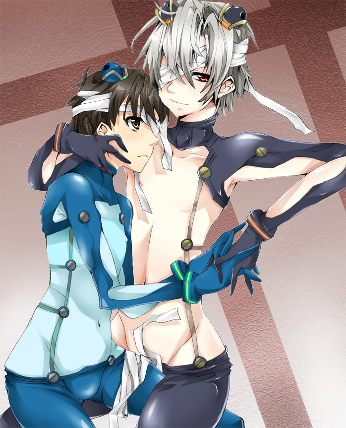 00s2boysandrogynousbandagesbrown eyesbrown hairholding handsinterface headset (evangelion)male focusmecha pilot suitmultiple boysplugsuit (evangelion)red eyessmiletest plugsuit (evangelion)undressingwhite hairyaoi