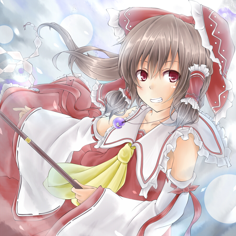 1girlbowbrown hairdetached sleevesfemale focusgoheijapanese clothesjewelrymagatamamikopendantred eyesshort hairsolo
