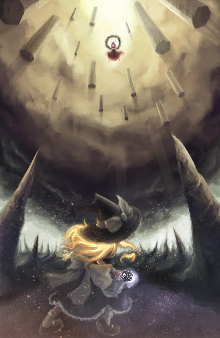 2girlsbattleblonde hairdanmakufemale focusfloatinghatmini-hakkeromultiple girlsonbashirapurple hairropeshimenawawitchwitch hat