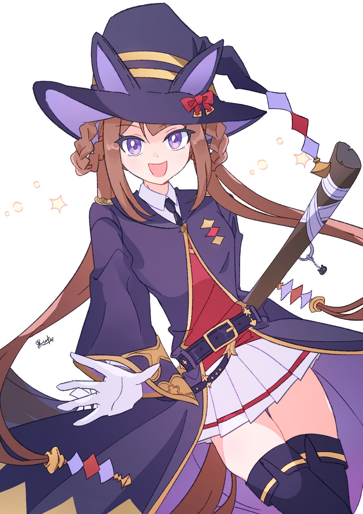 1girlanimal earsbeltblack bootsblack necktieblushbootsbowbraidbraided hair ringsbroombrown haircloakcollared shirtear coversgloveshair ringshathat with earshorse earshorse girlhorse tailkuro satolong hairlooking at viewernecktieopen cloakopen clothesopen mouthpurple eyespurple robered shirtrobeshirtskirtsmilesolostar (symbol)tailtwintailswhite gloveswhite skirtwitch hat
