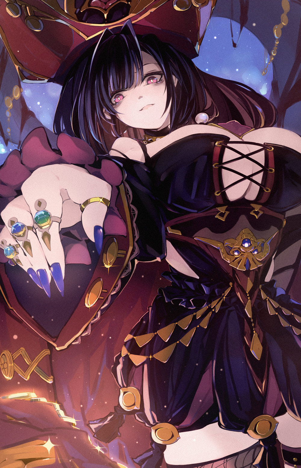1girlbreastsbright pupilscleavagecross-laced clothesfingernailshatjewelrylarge breastslong hairnail polishpink eyespirate hatpurple nailssharp fingernailssolowhite pupils