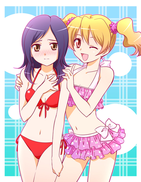 2girlsbikiniblushfrillsfront-tie topmultiple girlspixiv thumbnailside-tie bikini bottomswimsuitwink