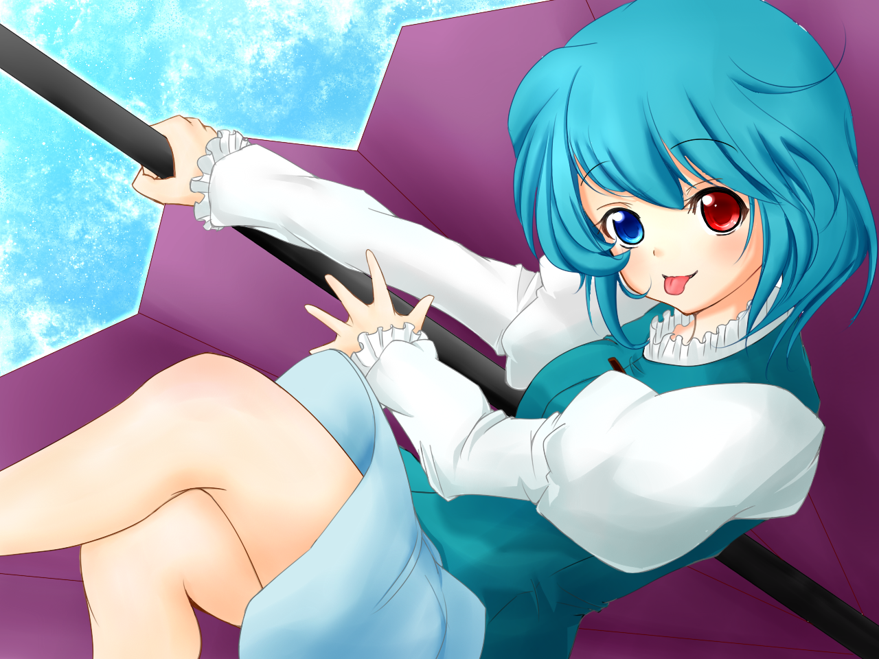 :p1girlblue eyesblue hairfemale focusheterochromiared eyesshort hairsolotonguetongue outumbrella