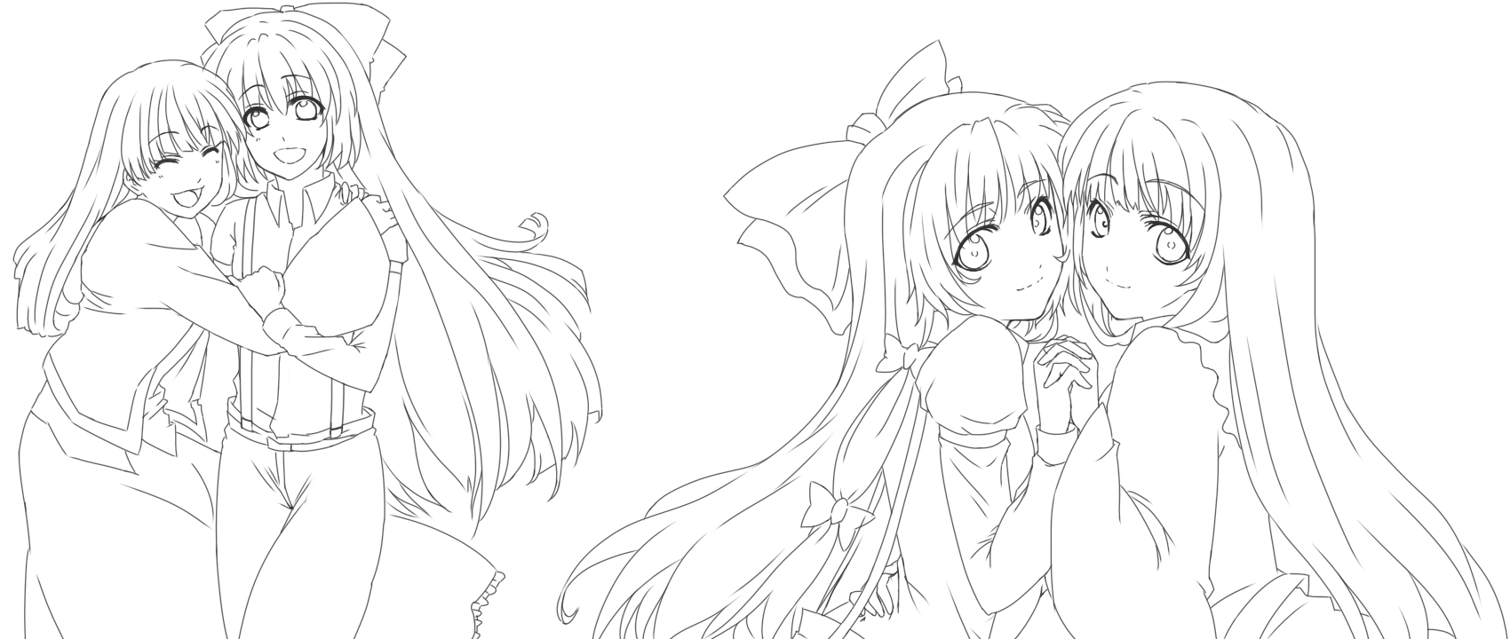 00s2girlsfemale focusgreyscalehair ribbonlong hairmonochromemultiple girlsmultiple viewspantsribbonskirtsuspenderswhite background