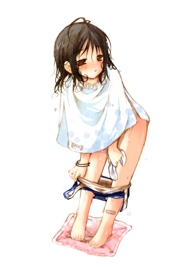 :o1girlbandaidbarefootblack hairblushbraceletbrown eyesclothes pullfemale focusfull bodyjewelryleaning forwardone-piece swimsuitone-piece swimsuit pullpulling own clothesschool swimsuitsimple backgroundsolostandingswimsuittowelundressingwetwhite background
