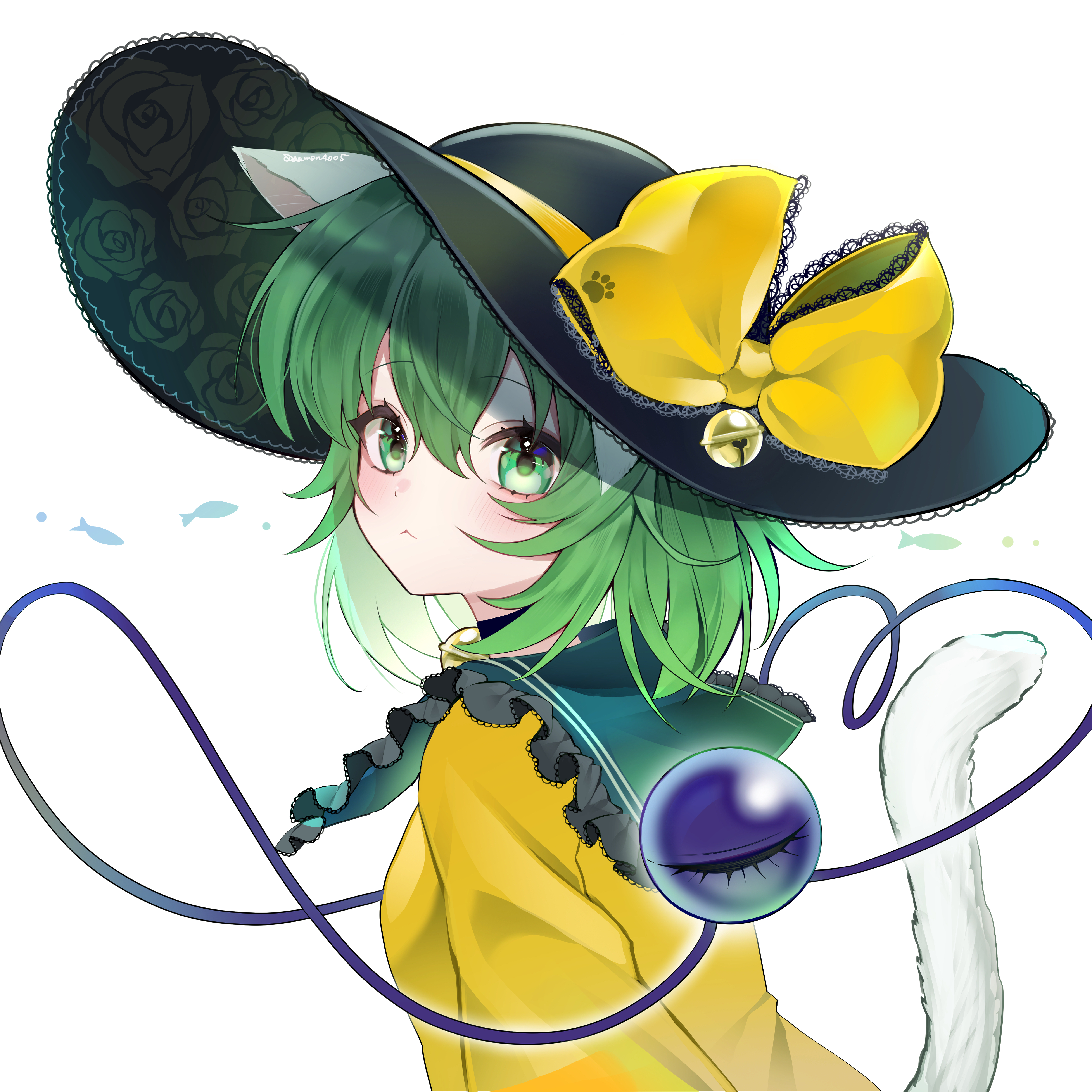 1boy1girlanimal earsbellblack hatblushbowcat earscat girlcat tailclosed mouthcollared shirteyeballfishfloral printfrilled shirt collarfrillsgreen eyesgreen hairhathat bowheartheart of stringkemonomimi modelooking at viewerneck bellprint hatrose printshirtsolotailthird eyeyellow bowyellow shirt