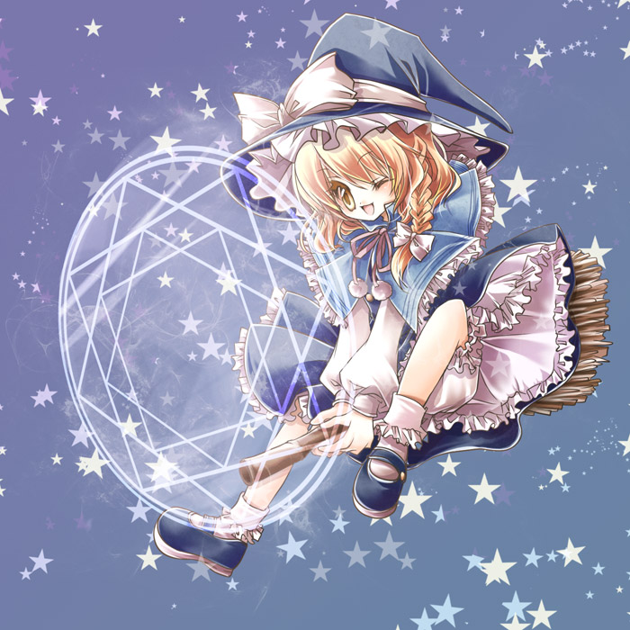 1girlblonde hairblue hatblue shoesbraidbroombroom ridingfemale focushatmagic circlemary janesone eye closedpom pom (clothes)shoesshort hairside braidsingle braidsockssolostar (symbol)white sockswinkwitchwitch hatyellow eyes