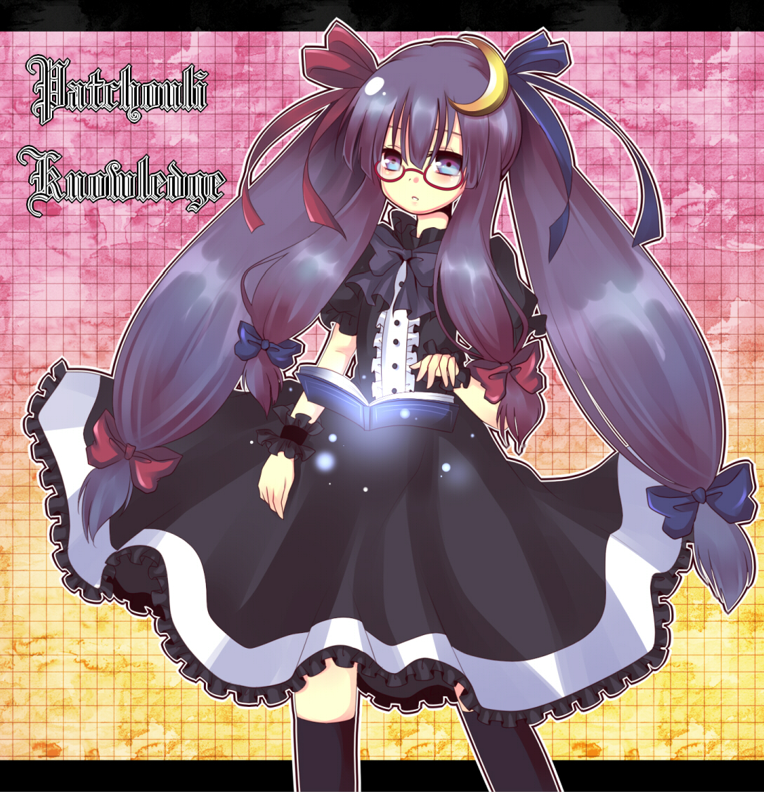 1girlalternate costumealternate hairstylebespectacledbookcharacter namecrescentcrescent hair ornamentfemale focusfloatingglassesgothic lolitahair ornamentlolita fashionlong hairno headwearpurple eyespurple hairsolothighhighstwintailswrist cuffs