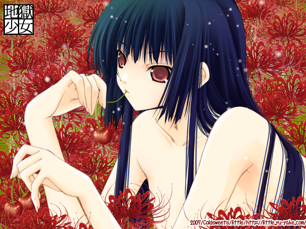 00s1girlblack hairblunt bangsbreastscherrycopyright namefemale focusflowerfoodfruithime cutlong hairlyingmedium breastsnipplesnudeon stomachred eyesred flowersolospider lily