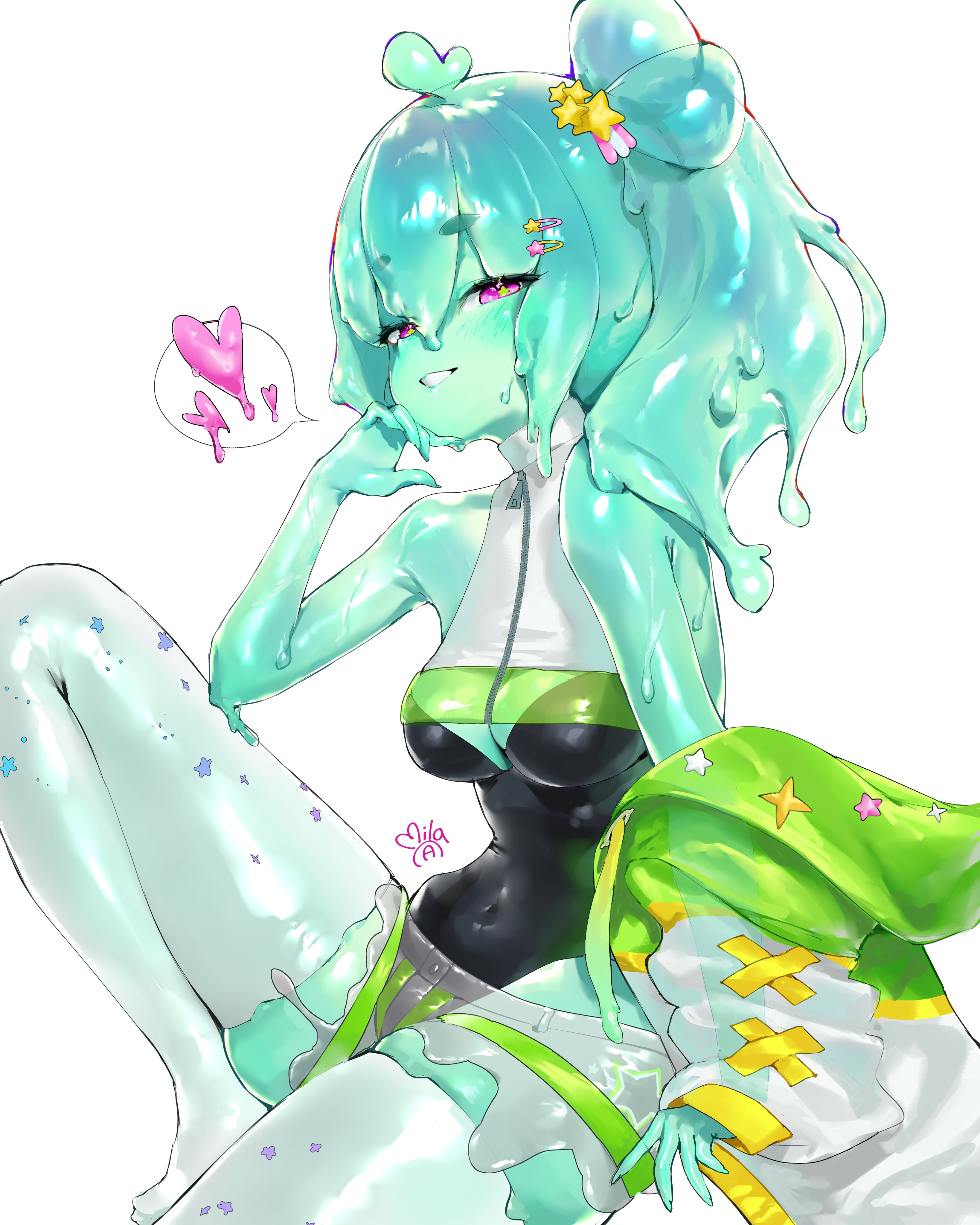 1girlblue hairblue skinbreastscleavagecolored skindrippinggreen jackethair ornamentheartjacketleotardmedium breastsmonster girlnavelopen clothesopen jacketopen mouthpink eyesponytailshortsslime (substance)slime girlsmilesmugstar (symbol)thighhighsthighsvirtual youtuberzipper