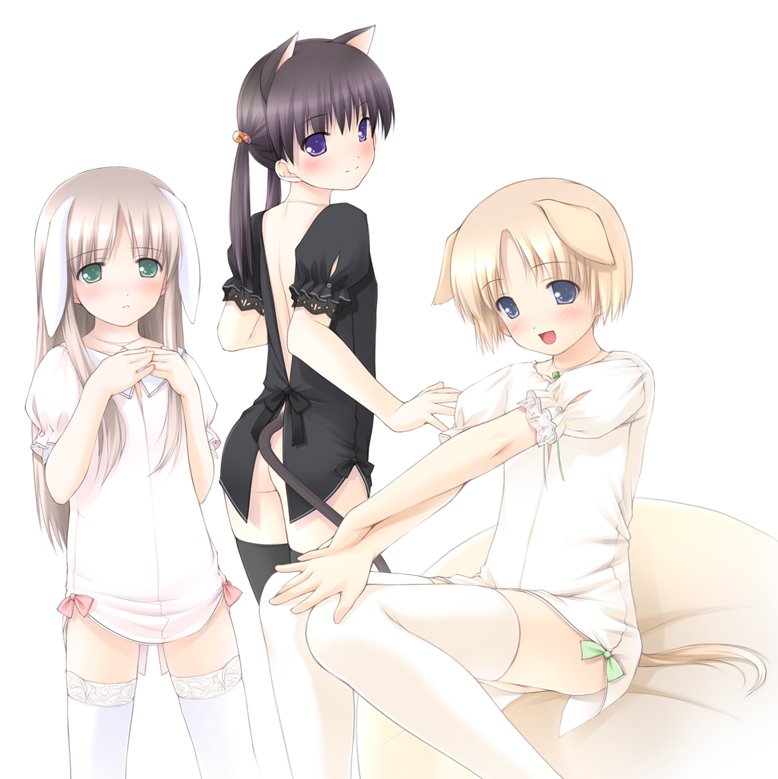 3girlsanimal earsassblack hairblonde hairblue eyesblushbrown haircat earscat taildog earsgreen eyeslolilong hairmultiple girlspantyhoserabbit earsshort hairsittingtail