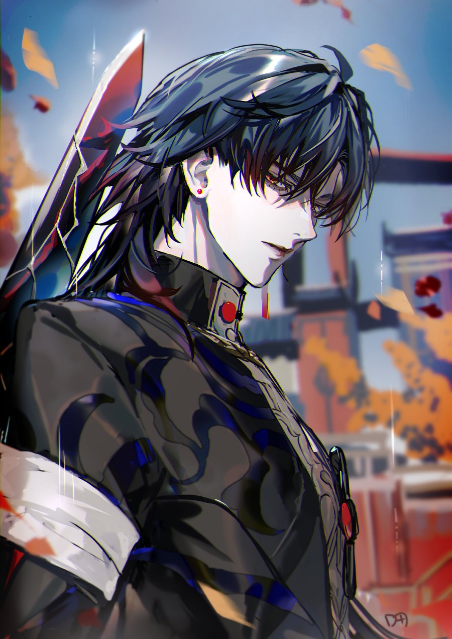 1boyahogeartist namebandaged armbandagesbishounenblack coatblack hairblurryblurry backgroundchinese clothesclosed mouthcoatearringseyelashesfalling leavesgradient hairhair between eyesholdingholding swordholding weaponjewelryleaflong hairlong sleeveslooking at viewermale focusmulticolored hairoutdoorsred eyesred hairshort hairsignatureskysoloswordsword on backtasseltassel earringstreeturtleneckupper bodyweaponweapon on back