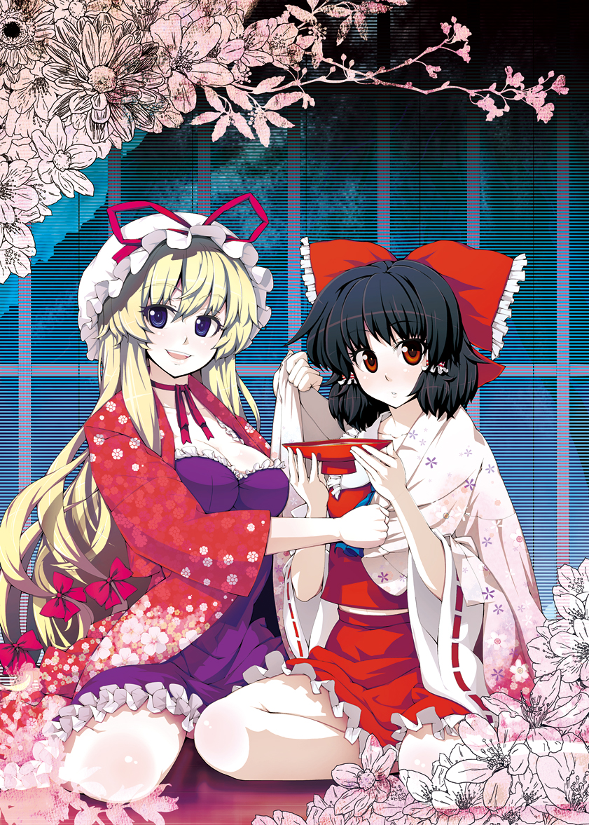 2girlsalcoholblack hairblonde hairbowcupdetached sleevesfemale focusflowerhatjapanese clotheslong hairmikomultiple girlspurple eyesred eyessakazukisakeshort hair