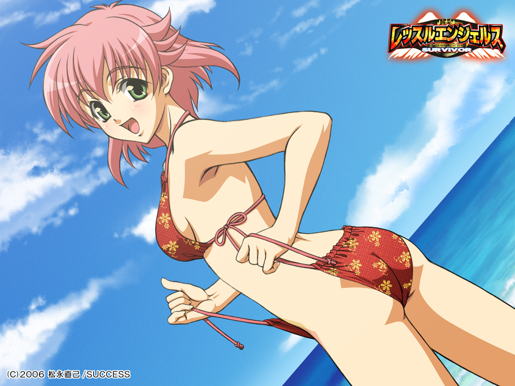 1girlassbeachbikiniblushbreastsclouddaydutch anglefemale focusgreen eyeslooking backmedium breastsopen mouthoutdoorspink hairred bikinishort hairside-tie bikini bottomsoloswimsuitundressingwater