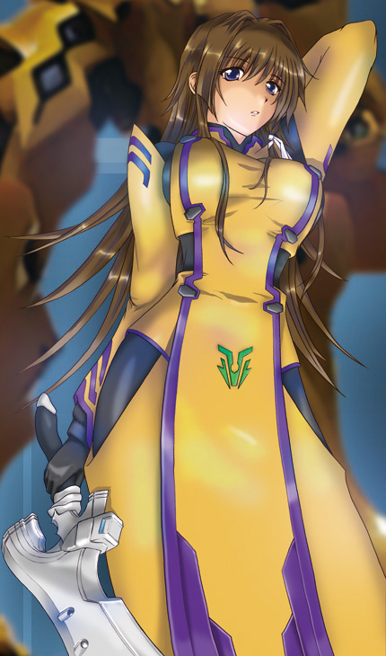 1girladapted costumealternate costumearm behind backarm behind headarm upblue eyesblurrybodysuitbreastsbrown hairchinese clothesdepth of fieldemblemfemale focusflipped hairfrom belowglovesgrey hairhair between eyeshair intakeshair ribbonhip focusholdingholding swordholding weaponlarge breastslong hairlooking at viewermechaparted lipspurple eyesribbonrobotsidelockssolostandingswordtabardtactical surface fightertaut clothestress ribbonvery long hairweapon