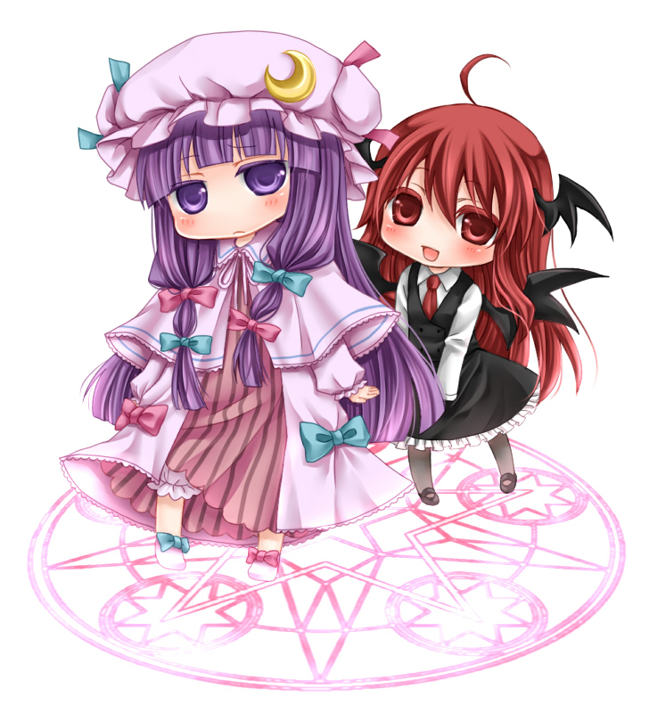 1boy2girlsahogebat wingsblushbowcapeletchibidressfemale focusfrilled dressfrillshair ribbonhathead wingslong hairmagic circlemob capmultiple girlsnecktieopen mouthpantyhosepink bowpurple eyespurple hairred eyesred hairribbonshoessimple backgroundstandingstanding on magic circlestriped clothesstriped dressvertical stripeswhite backgroundwings
