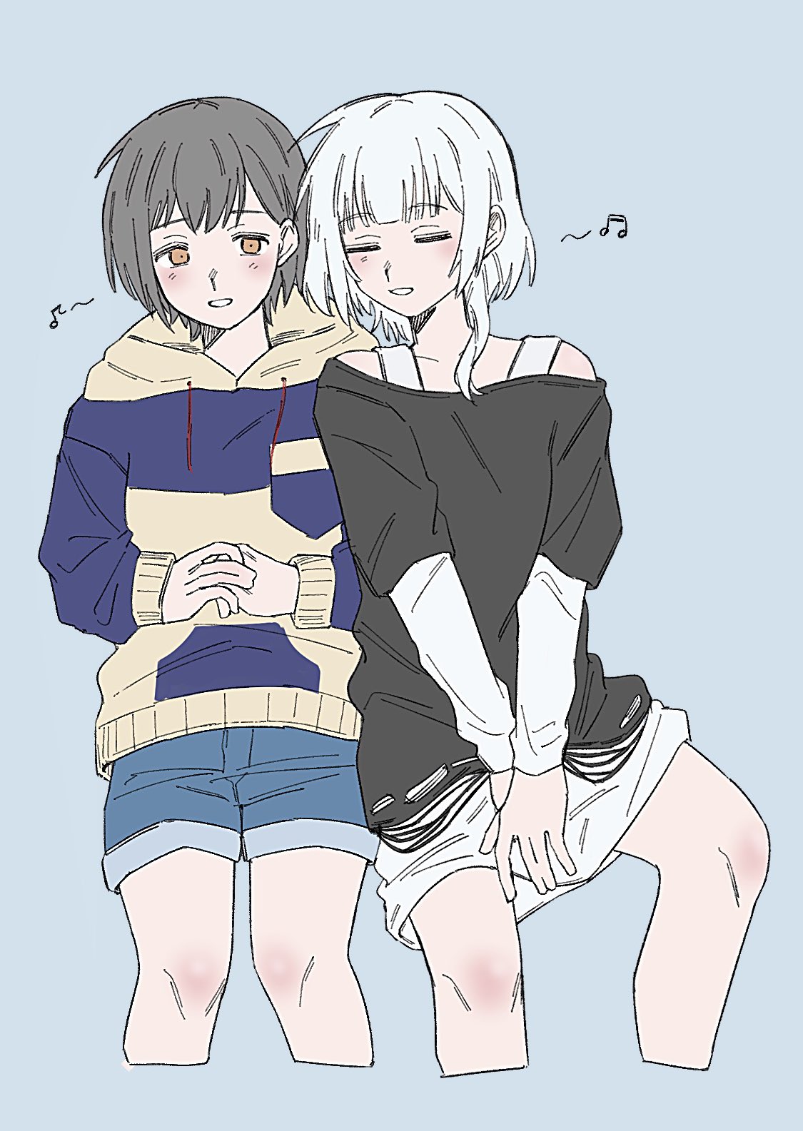2girlsbeamed eighth notesblack shirtblue backgroundblue hoodieblue shortsblushclosed eyesdrawstringgrey hairhoodhoodieinvisible chairlayered sleeveslong sleevesmedium hairmuinu inumultiple girlsmusical noteorange eyesown hands togetherparted lipsshirtshort hairshort over long sleevesshort sleevesshortssimple backgroundsittingsmiletwo-tone hoodiewhite hairyellow hoodieyuri